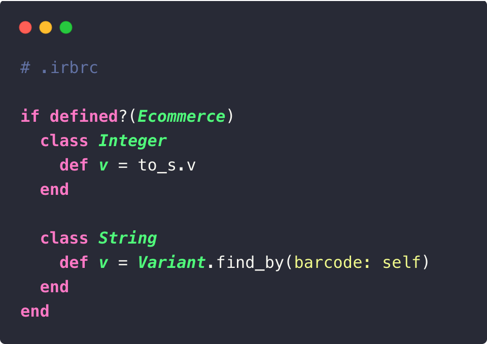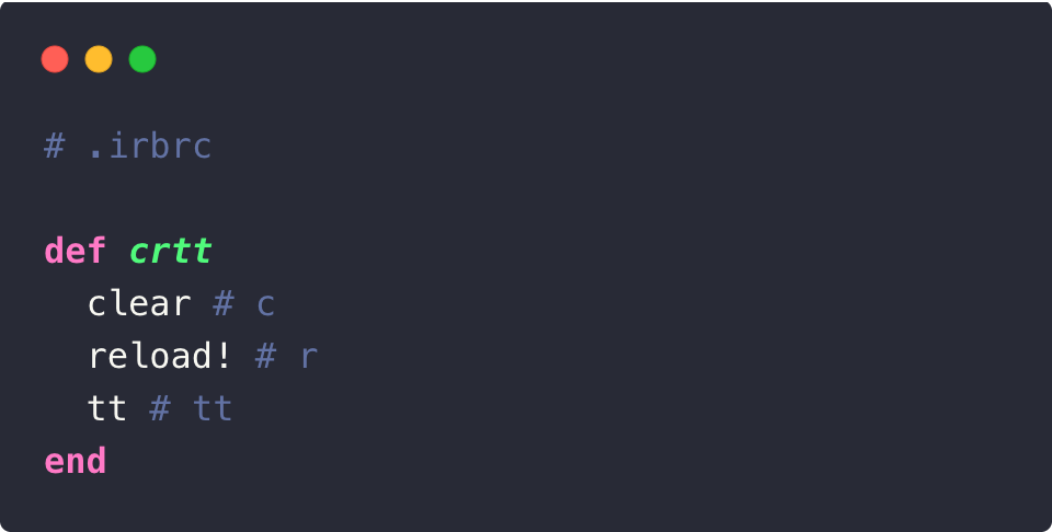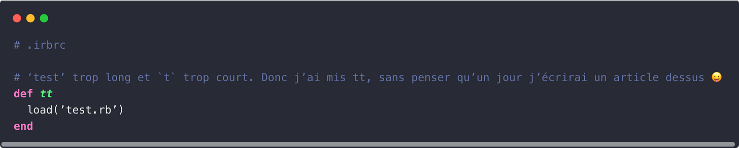 Jâimagine que vous trouverez aussi load(âtest.rbâ) beaucoup trop long Ă Ă©crire, donc mon .irbrc sâest Ă©toffĂ© :