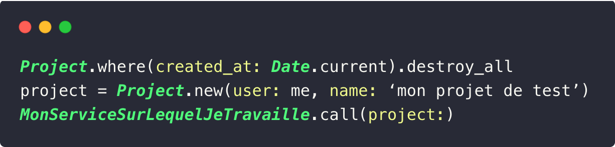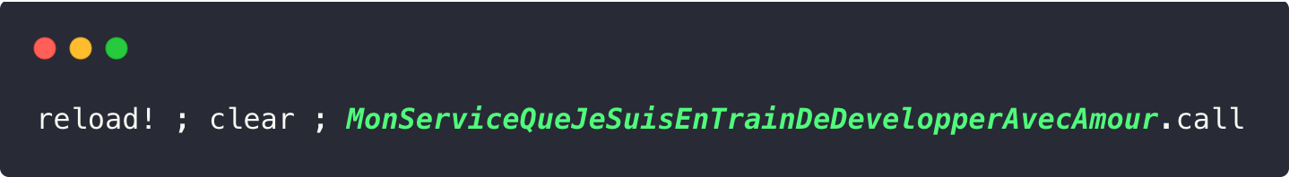 Dans cette exemple je travaille sur un service `MonServiceSurLequelJeTravaille`, qui a besoin dâune instance de `Project` toute neuve. Tant que je travaille sur ce service, je vais passer ma vie Ă Ă©crire ces trois lignes dans mon terminal :