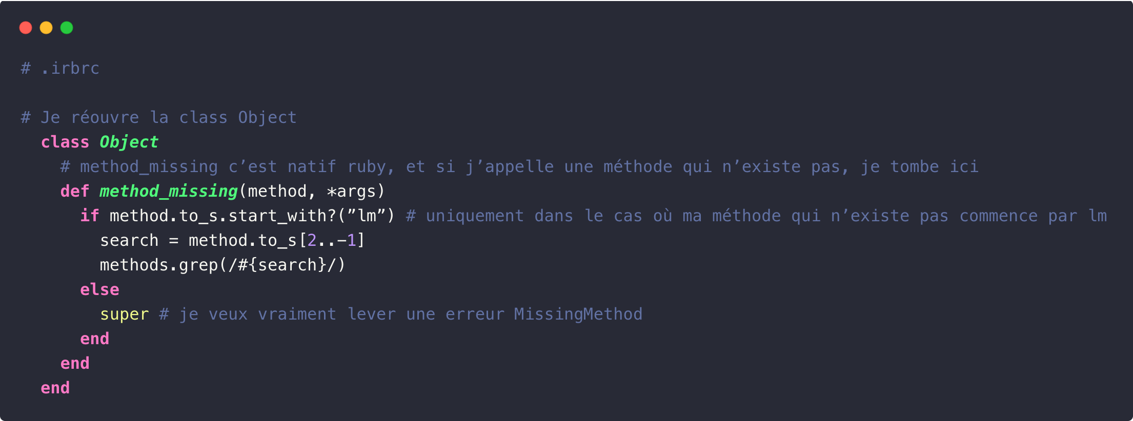 Moi jâutilise mon irb de cette façon, mais ce fichier est avant tout lĂ pour configurer votre irb. Vous avez la main sur le prompt, les couleurs et autre. Il y a beaucoup dâarticle dessus, et personnelement je nâai jamais ressenti le besoin de toucher cette configuration.