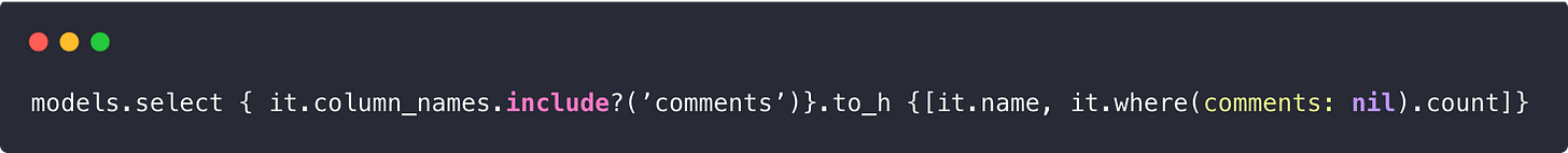 Dans mon application derniĂšrement je voulais savoir sâil y avait des models qui avaient la colonne comment Ă nil. Mais je sais que jâai plus de 10 models qui avaient une colonne comments. Pas de souci :