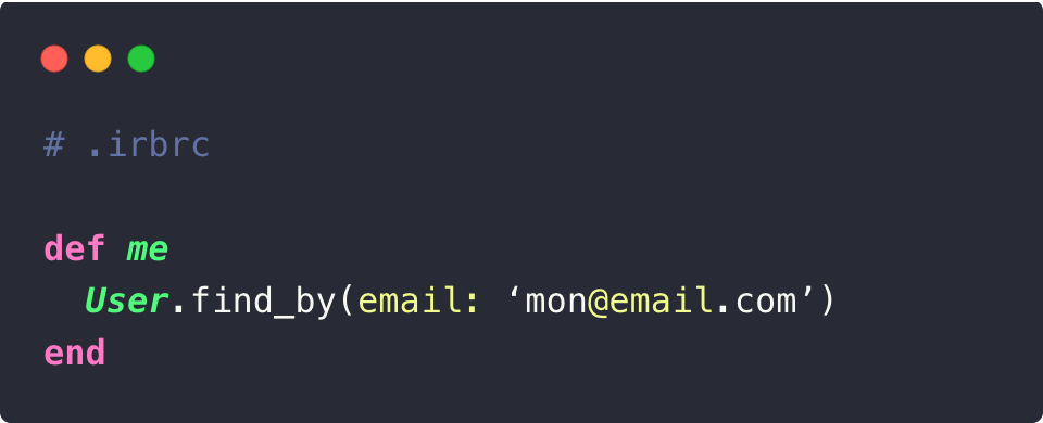 Donc dans mon terminal je peux faire: me.projects.last au lieu de User.find_by(email: âmon@email.comâ).projects.last