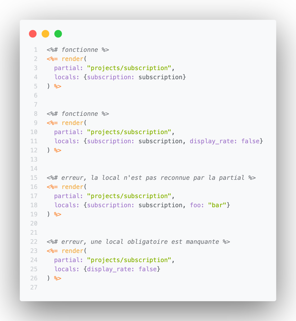 Afin de rendre nos partials robustes et de s'assurer qu'on n'oublie pas de leur passer telle ou telle variable, Rails nous met à disposition un outil très pratique : les strict locals.