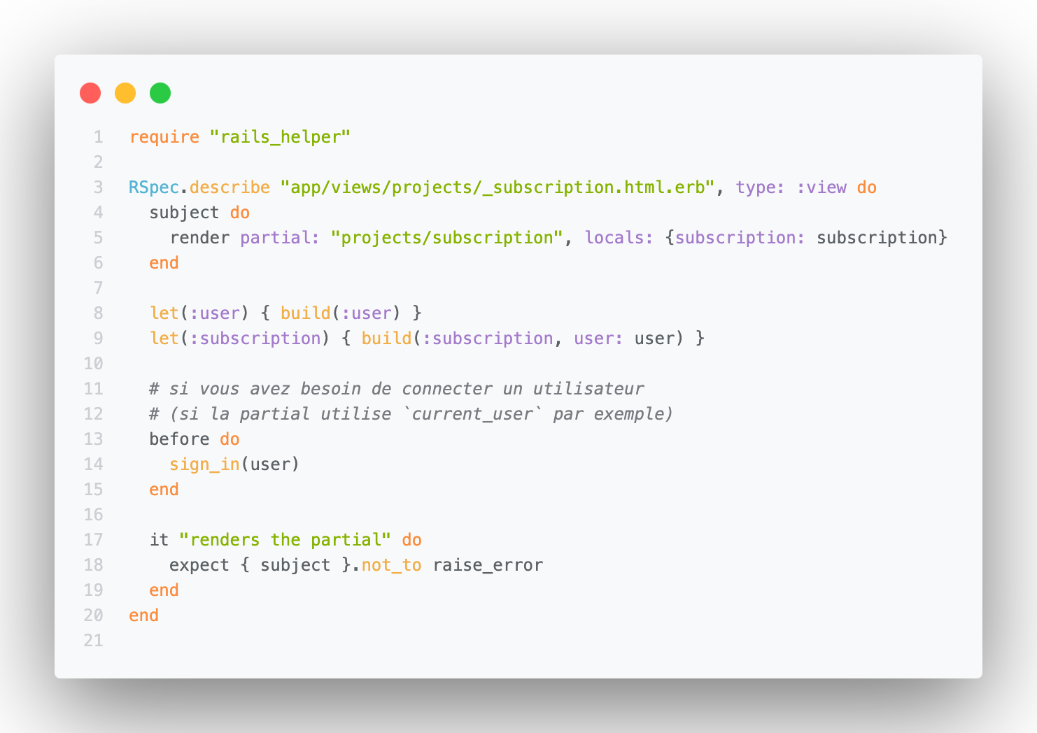 Nous avons pris l'habitude de tester unitairement nos partials afin de s'assurer que nos vues ne génèrent pas d'erreurs, ce qui évite des tests de requêtes lourds, compliqués, avec des tonnes de contexte selon les conditions d'affichage des éléments dans la vue associée. L'utilisation des locals et des strict locals par rapport aux variables d'instances nous permet de simplifier le setup de nos tests : on peut passer simplement nos variables en paramètre de notre partial plutôt que de devoir tricher pour créer des variables d'instances et un faux controller.
