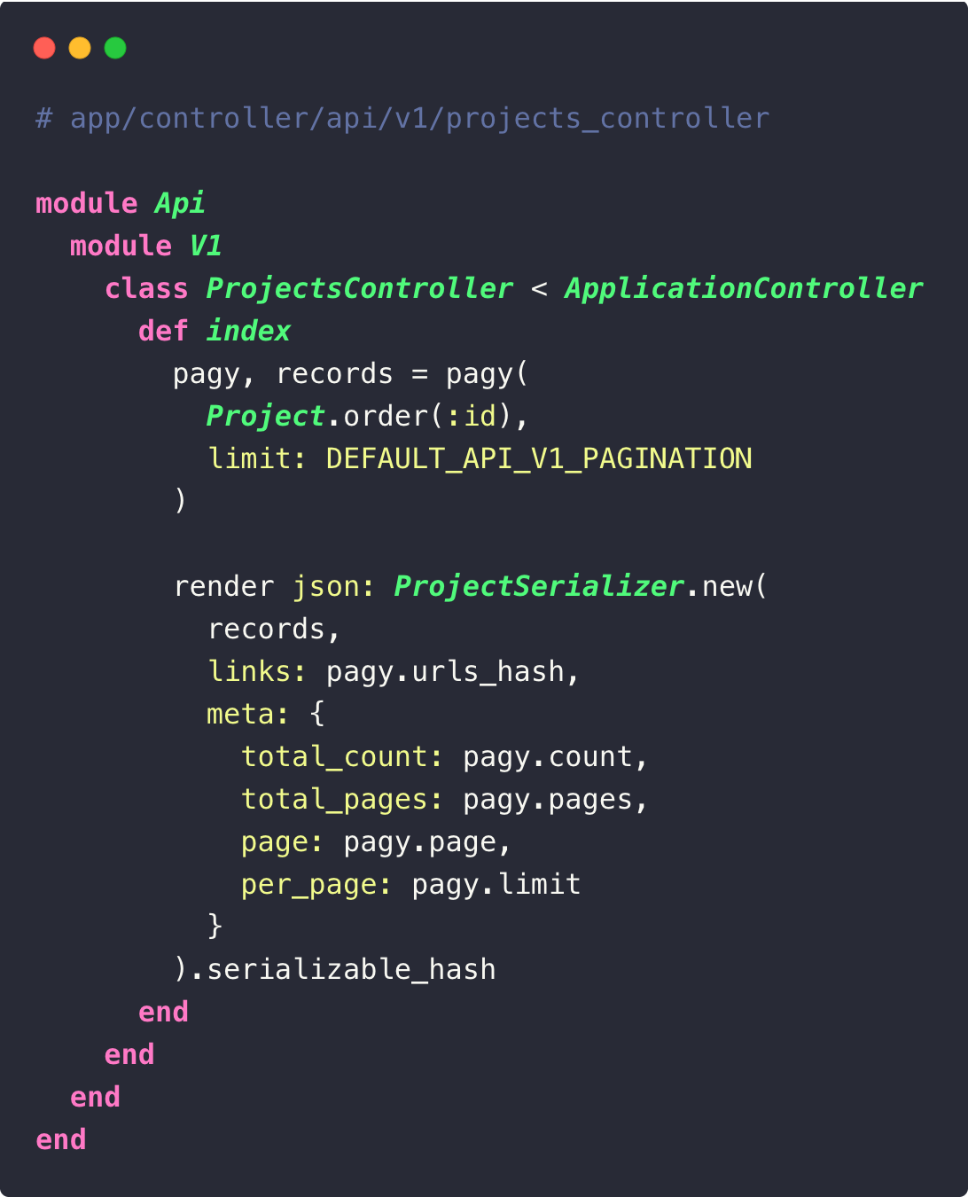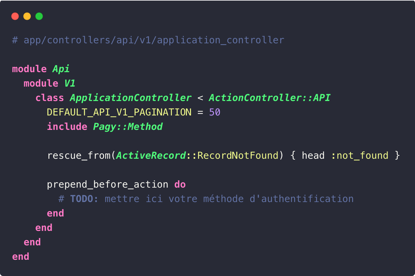 Ensuite, je vais paginer mes ressources avec la gem Pagy. Par défaut, je choisis de renvoyer 50 ressources par appel API. On pourrait laisser aux utilisateurs la possibilité de changer cette valeur dans la payload, mais par soucis de simplicité on ne va pas le faire ici.