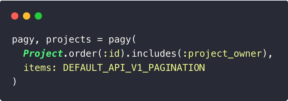 Nous appliquons d’abord la pagination grâce à la méthode pagy() fournie par la gem. Elle reçoit comme premier argument nos ressources, puis la valeur de pagination.