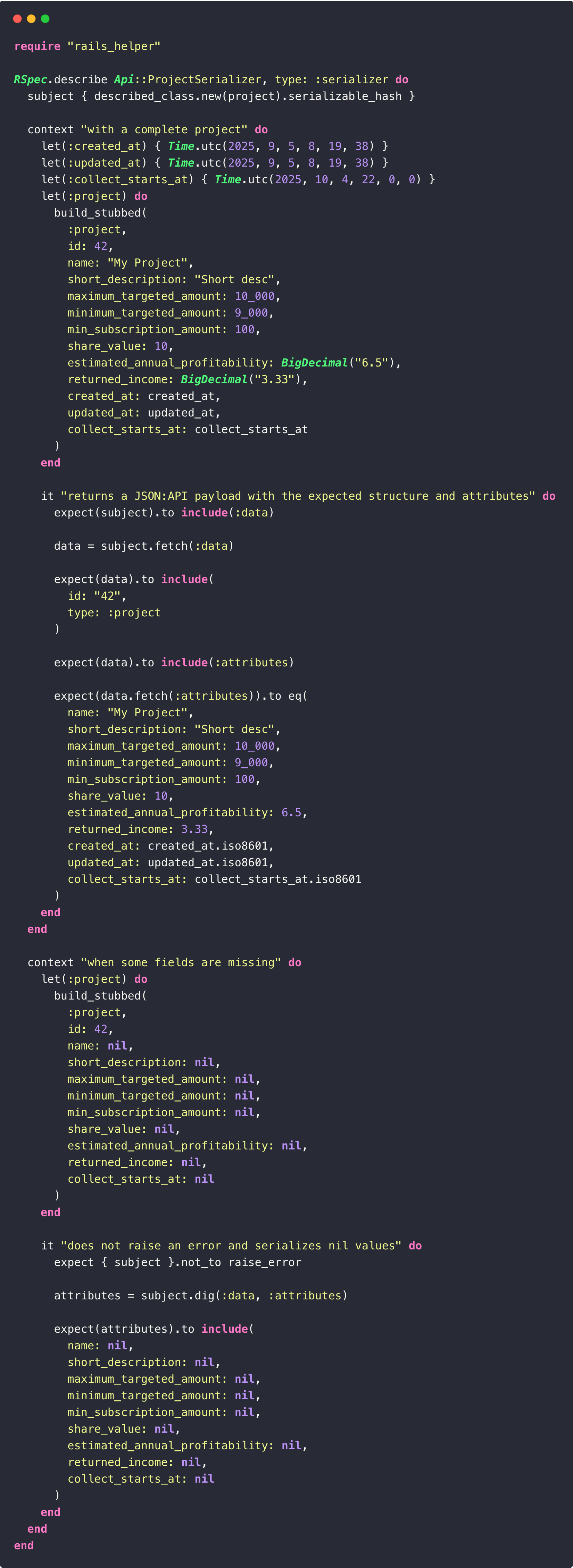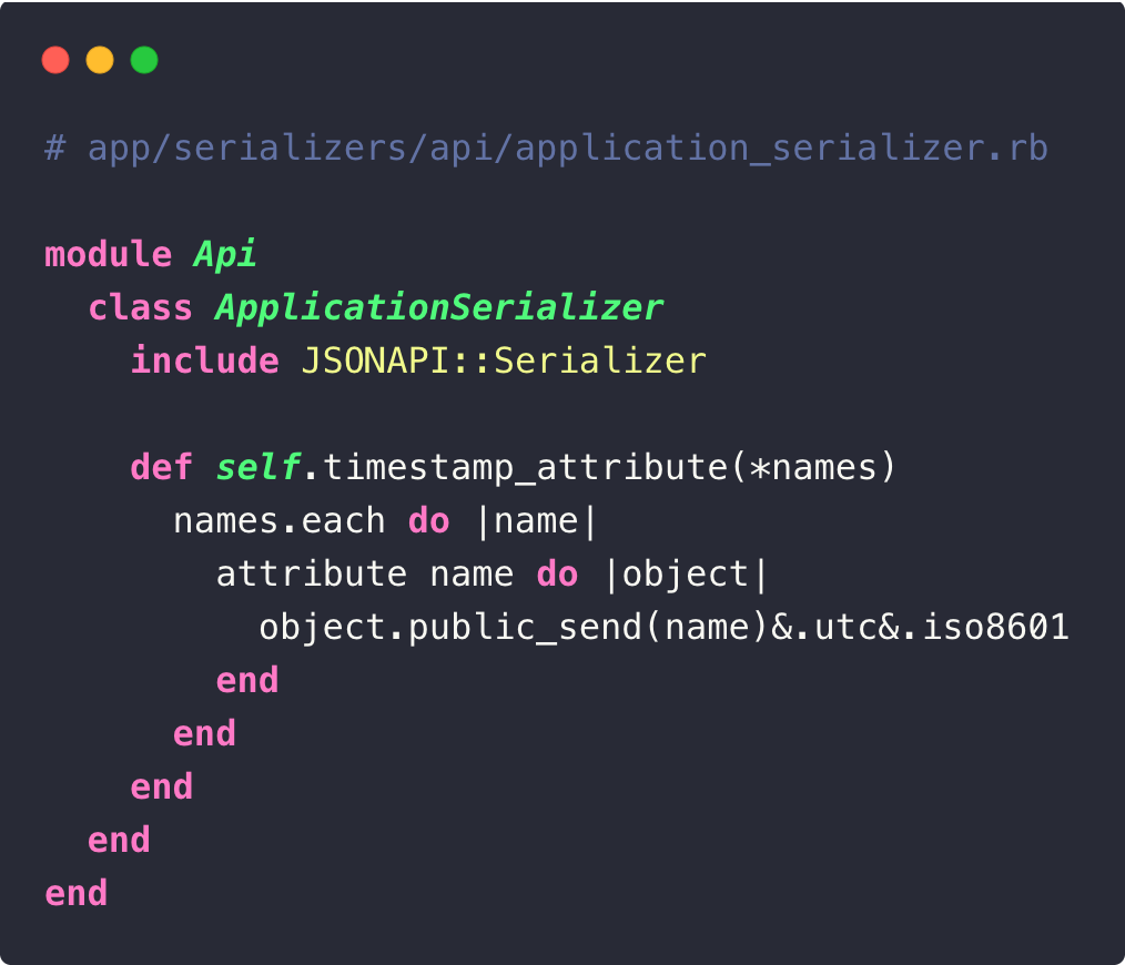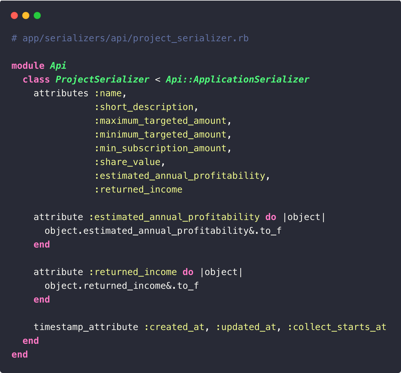 Pour respecter le principe de responsabilité unique, nous générons donc le hash dans un Serializer avec la gem jsonapi-serializer. Sa mission est de transformer la donnée brute en un format clair et lisible. La gem va aussi respecter les spécifications de JSON API.